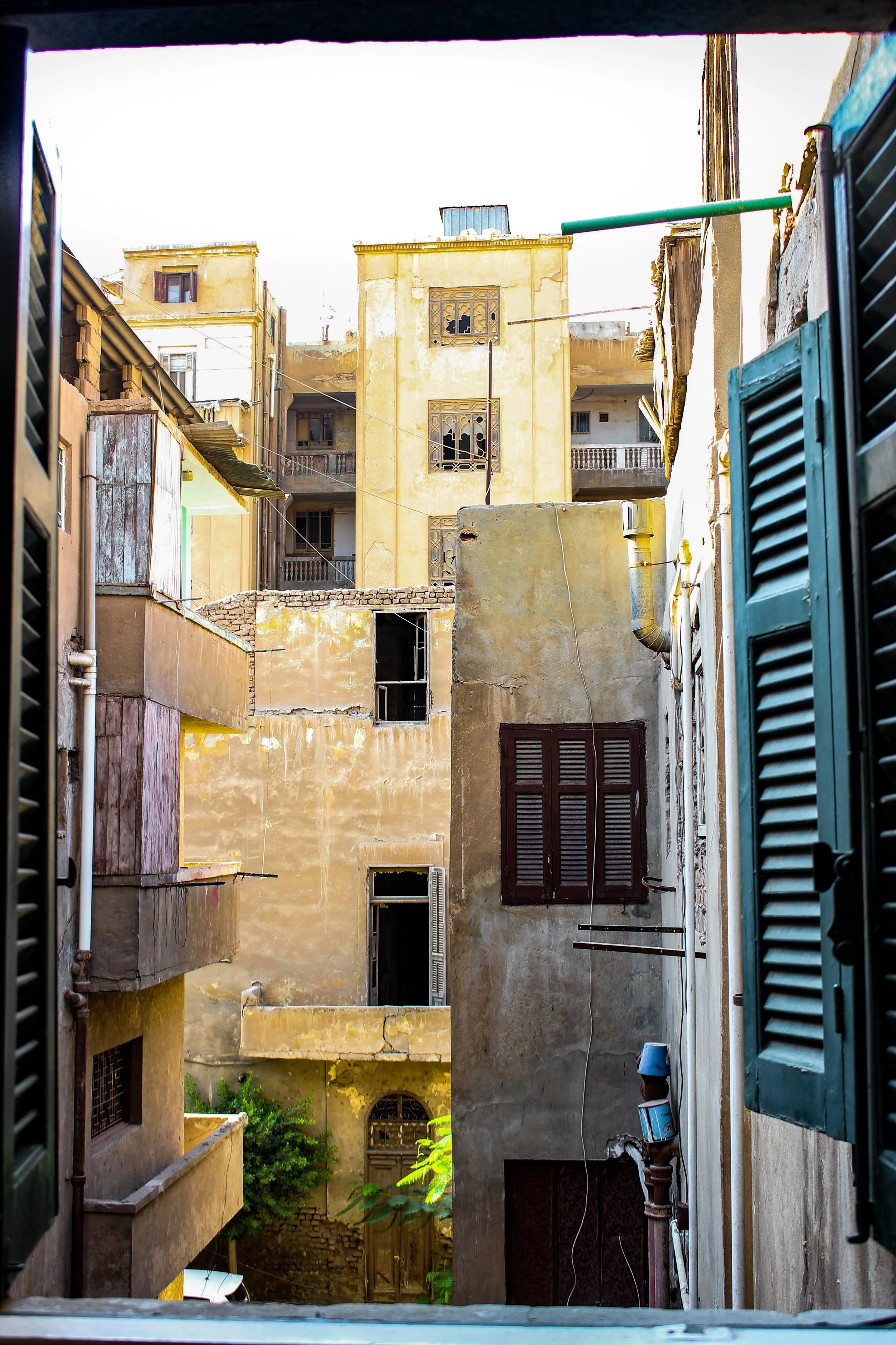 An ally of historic urban buildings at the city of Al Mansoura, where there are remnants of a mixture of European and Ottomanic wooden architecture of windows, balconies, and doors. Some apartments remain occupied and passed on to family relatives, while others have been uninhabited for years.